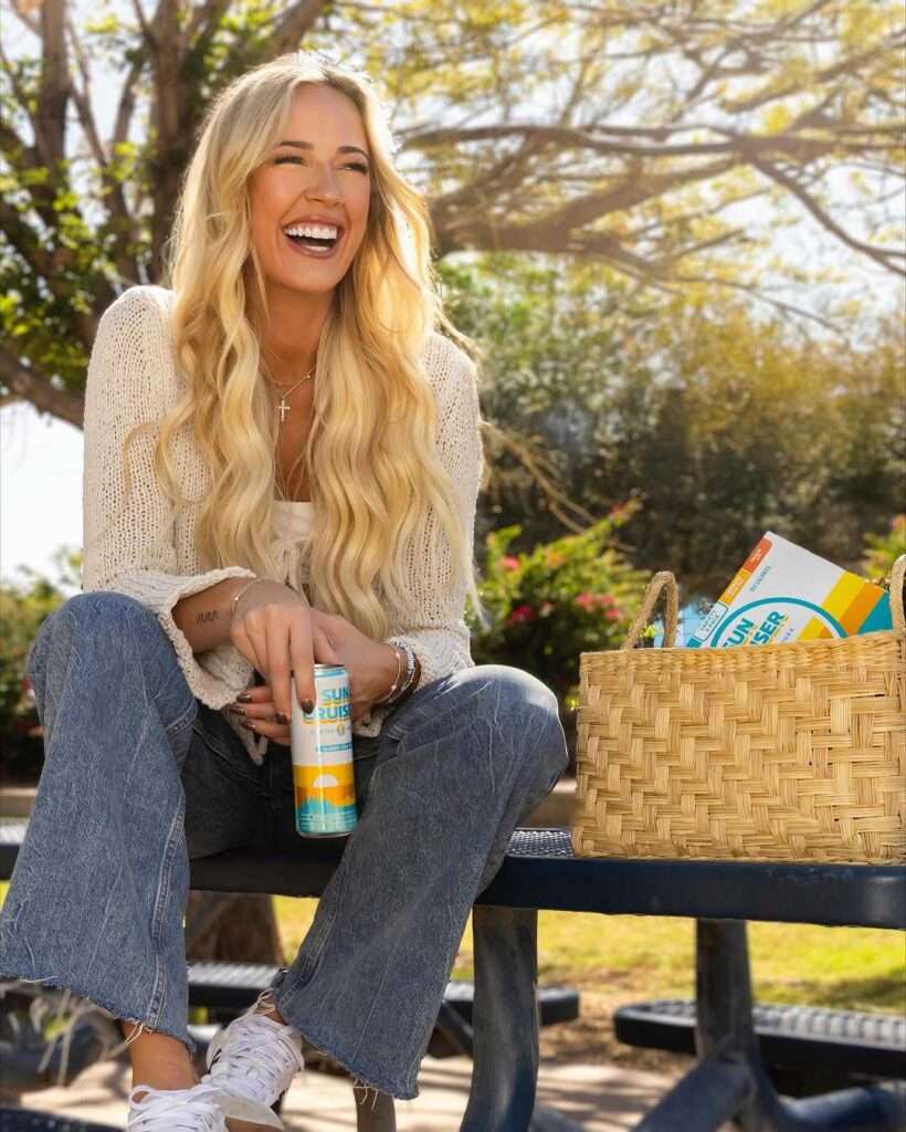 The image came from a Sun Cruiser canned cocktail shoot. Cunningham posed beside a picnic basket with a relaxed smile and a can in her hand. Viewers asked if this was a product launch, a romance movie trailer or a federal attempt to raise national morale. The brand simply confirmed that she understood the assignment.