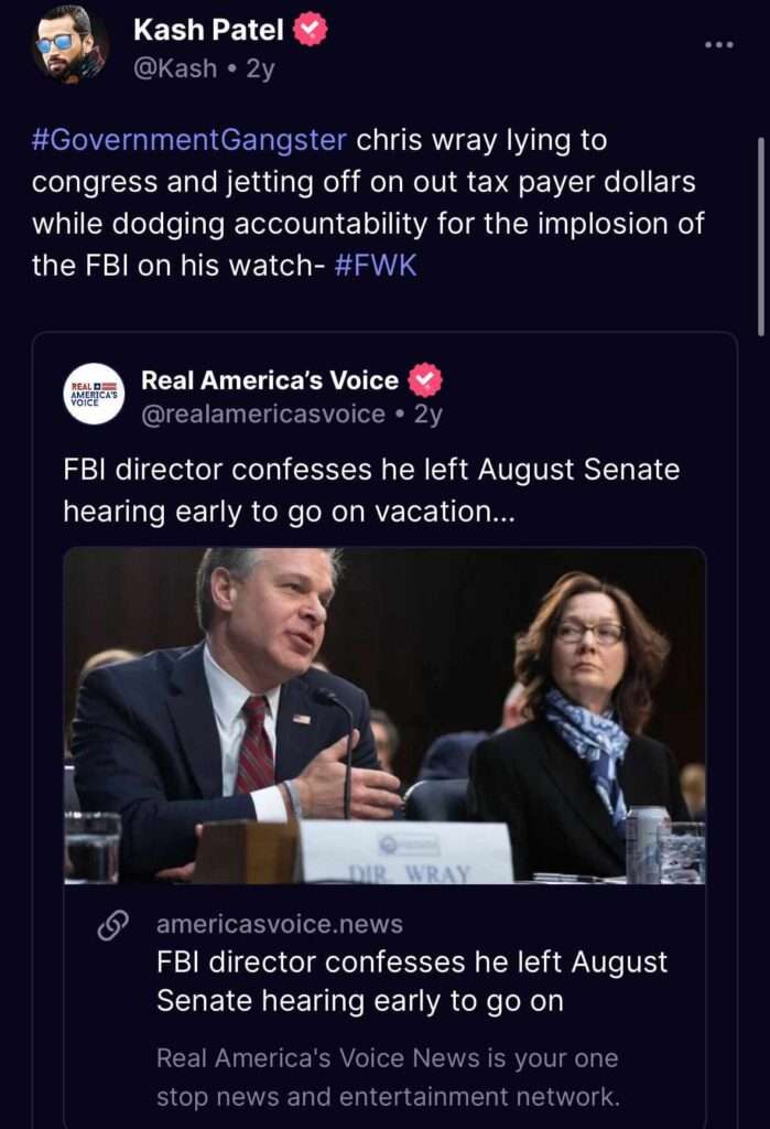 Critics were quick to recall Patel’s earlier criticism of former FBI Director Christopher Wray for taking similar trips. In 2023, Patel accused Wray of “flying around like an entitled rock star” and said his taxpayer-funded jet “should be grounded immediately.” When pressed on the apparent hypocrisy, Patel replied, “That was different. Wray wasn’t in love or wearing cowboy boots.”